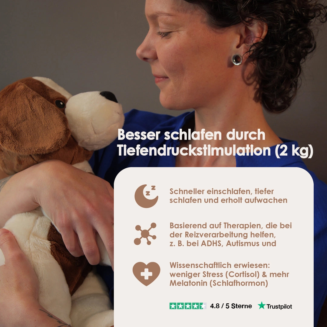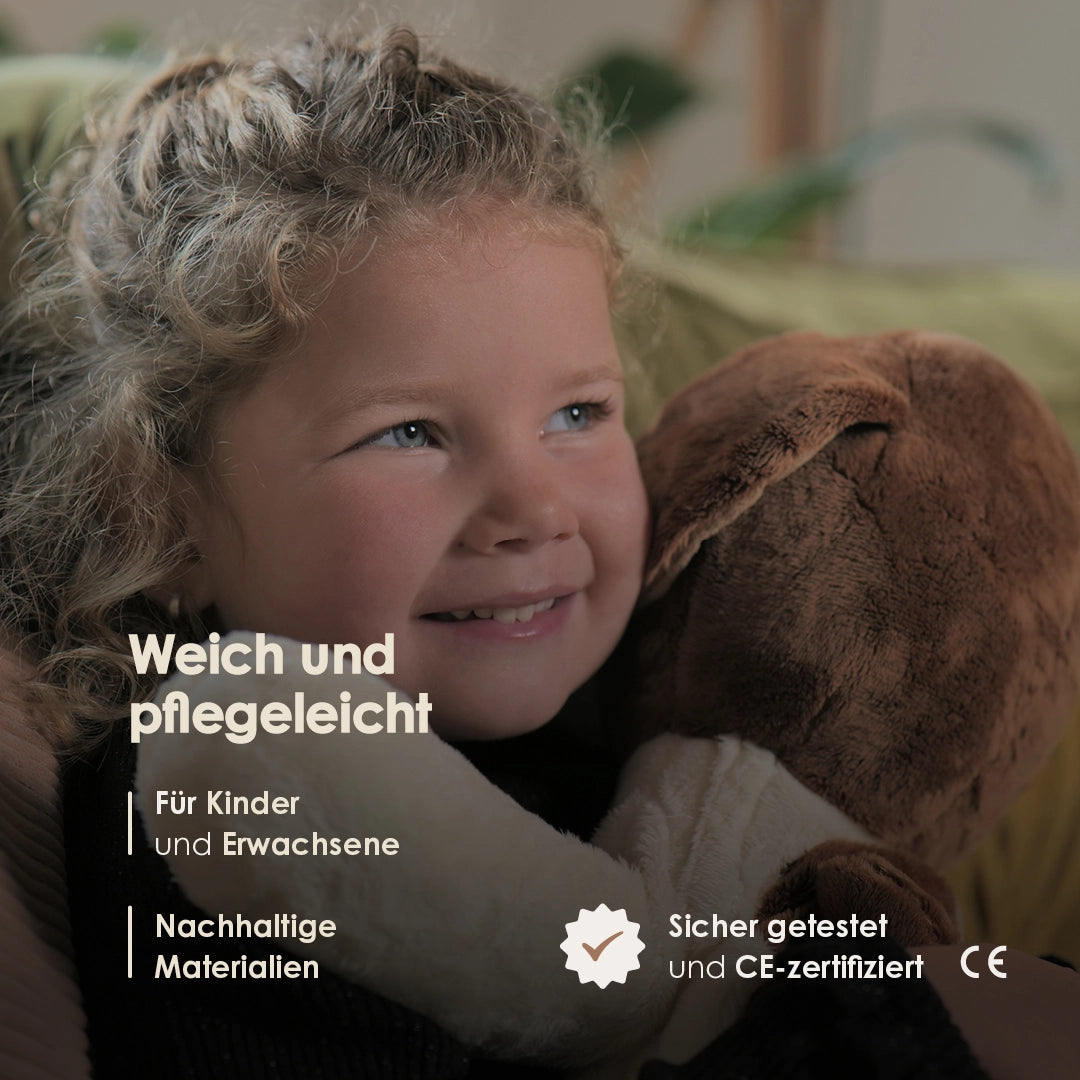 Gewichtete Kuscheltiere eignen sich sowohl für Kinder (ab 3 Jahren) als auch für Erwachsene und können bei Stress, Angst, emotionalen Herausforderungen unterstützen und dem Körper helfen, sich zu entspannen.